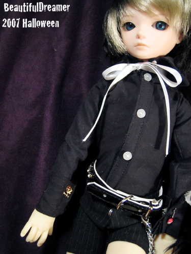 袖の折り返しと尖り襟がお気に入り。黒地に白釦に白リボンタイもやりたかったんで(笑)