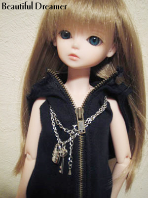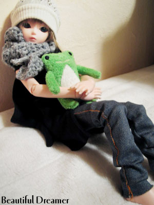 首に巻いてるのは私のペンダントだったのですが首の回りかぶれちゃって使い物にならなかった物の再利用。少年っぽくて可愛いかなぁと。て言うかTFサイズのスニーカー欲しいな…デニムに合わせても可愛いかなーと思います。