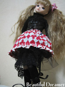 このトランプ柄、あと2mばかりああるからもっとモッサリしたドレスとか作ったらかわいいかな。ブライスとおそろでアリスのティーパーティー風味なんてのも可愛いかもしれぬ。アリスが好きだー。大好きだー。しかし2mあったらどんだけ作れるんだよ(笑)